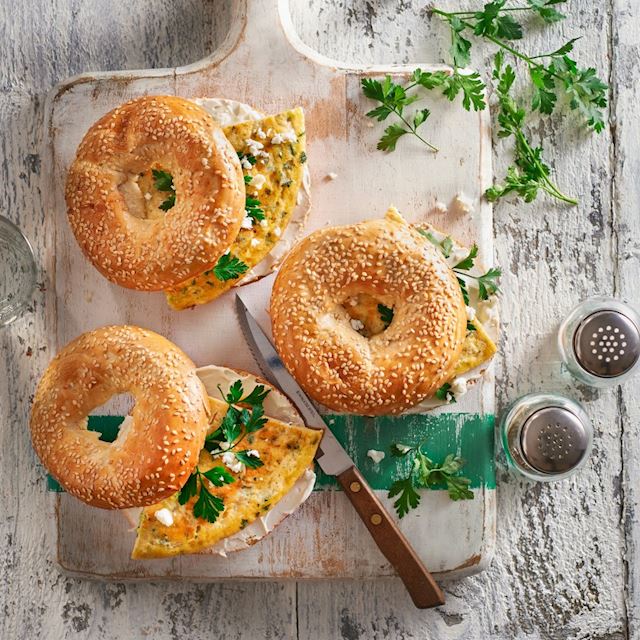 Brush two baking trays with oil and dust a tray with flour. Turn out the dough onto a lightly floured surface and knock back with your fist . Knead for 2 minutes, then divide into ten pieces. Shape each piece into a ball and leave to rest for 5 minutes. Gently flatten each ball with a lightly floured hand and make a hole in the center with the handle of a wooden spoon. Put the bagels on the floured tray, cover with a damp tea towel and leave to rise in a warm place for 20 minutes.