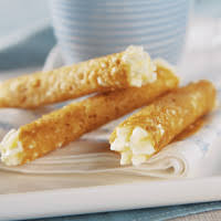 Remove the first baking tray the oven and leave to cool for about 30 seconds, then lift each round with a palette knife and wrap around the handle of a wooden spoon. If the brandy snaps start to become too firm to wrap, return them to the oven for about 30 seconds to soften again. When firm, remove from the spoon handles and finish cooling on a wire rack. Repeat with the remaining baking trays.