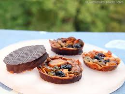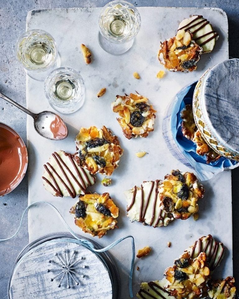 Cut around the florentines and remove from the baking paper. Spread the remaining melted chocolate on the coated side of the florentines and use a form to mark waves in the chocolate. Leave to set.